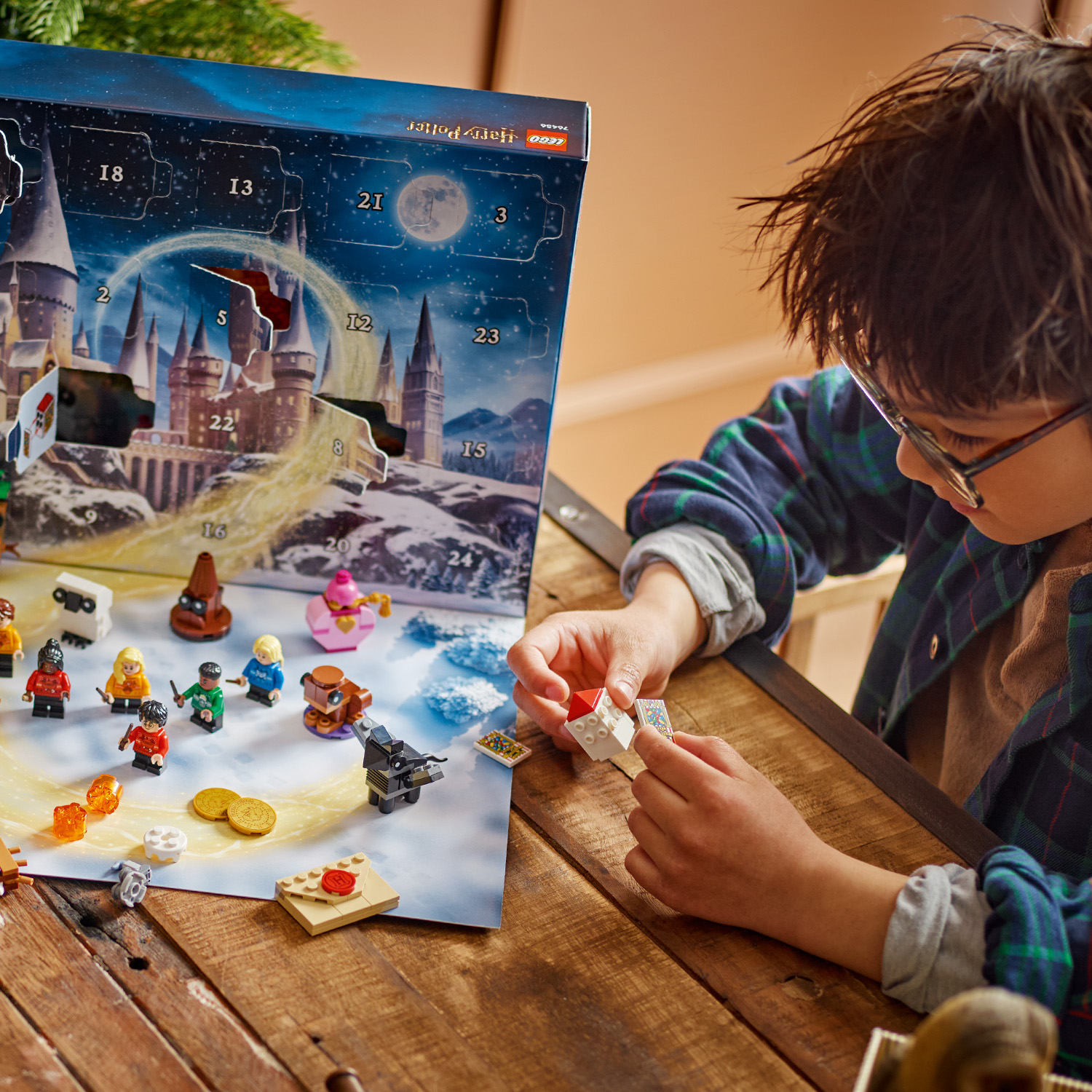 Adventní kalendář obsahuje figurky LEGO kouzelných tvorů, jako je Klofan, Aragog a patron v podobě jelena. Součástí je také 8 minifigurek oblíbených postav LEGO, včetně Harryho Pottera, Cho Changové, Draca Malfoye a Lenky Láskorádové, které na sobě mají bradavické vánoční svetry a v rukou hůlky. Nechybí spousta sběratelských mini modelů slavných předmětů, jako je dopis o přijetí do Bradavic, krabička Bertíkových fazolek tisíckrát jinak, Moudrý klobouk, řada kouzelných lektvarů a Obludné obludárium, se kterými si děti užijí ještě více herních možností. Model obsahuje 278 dílků.